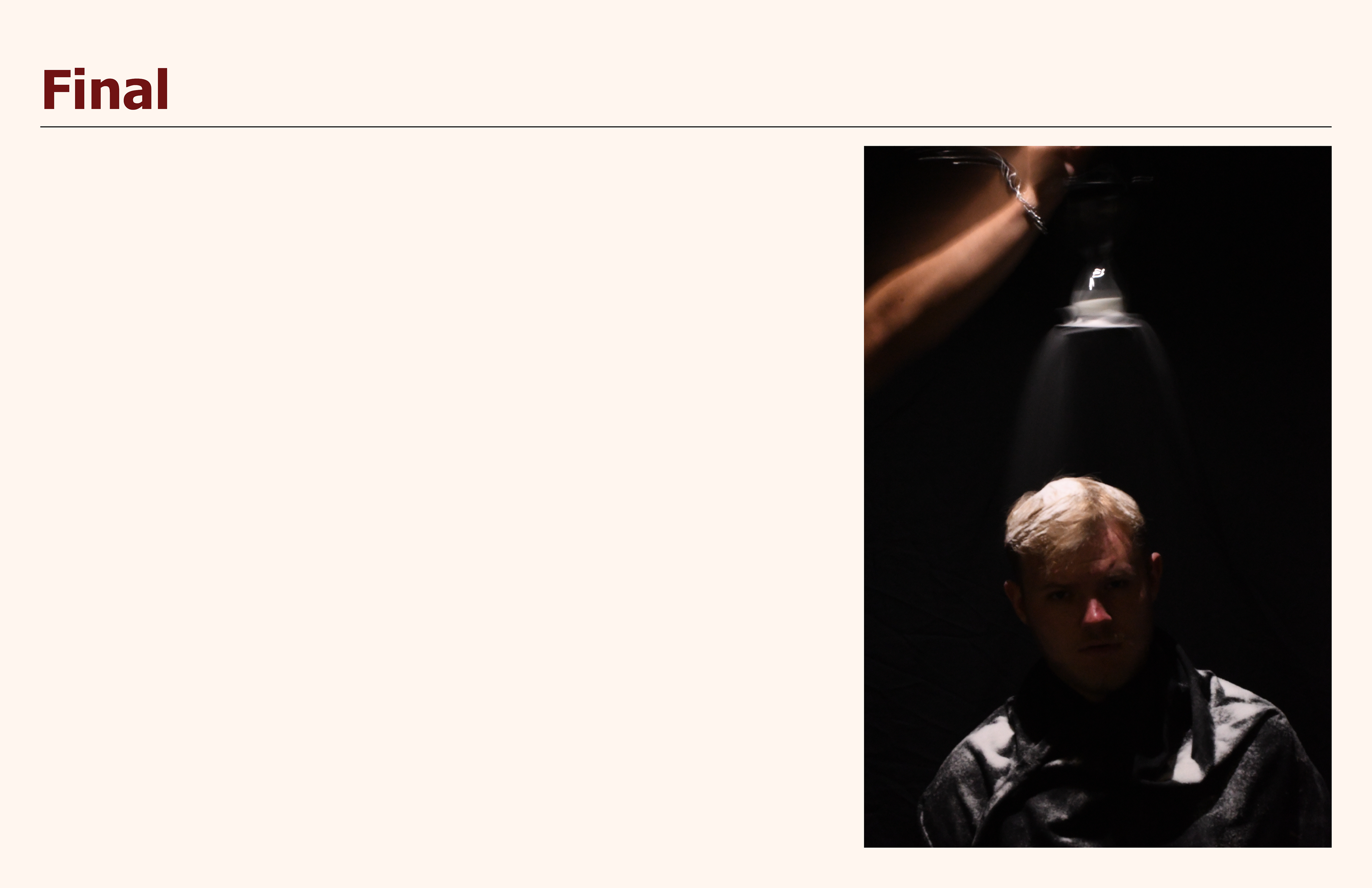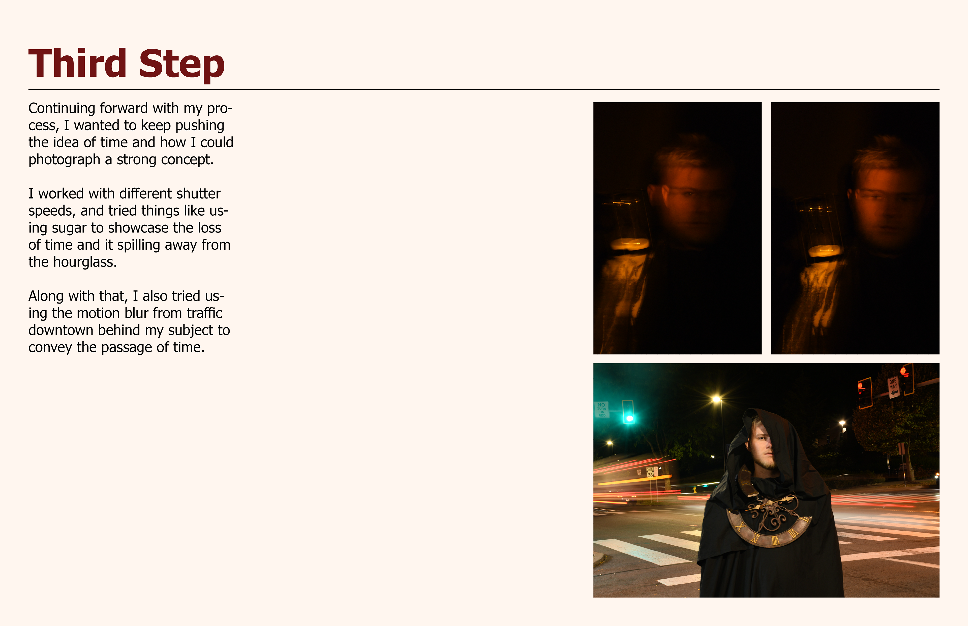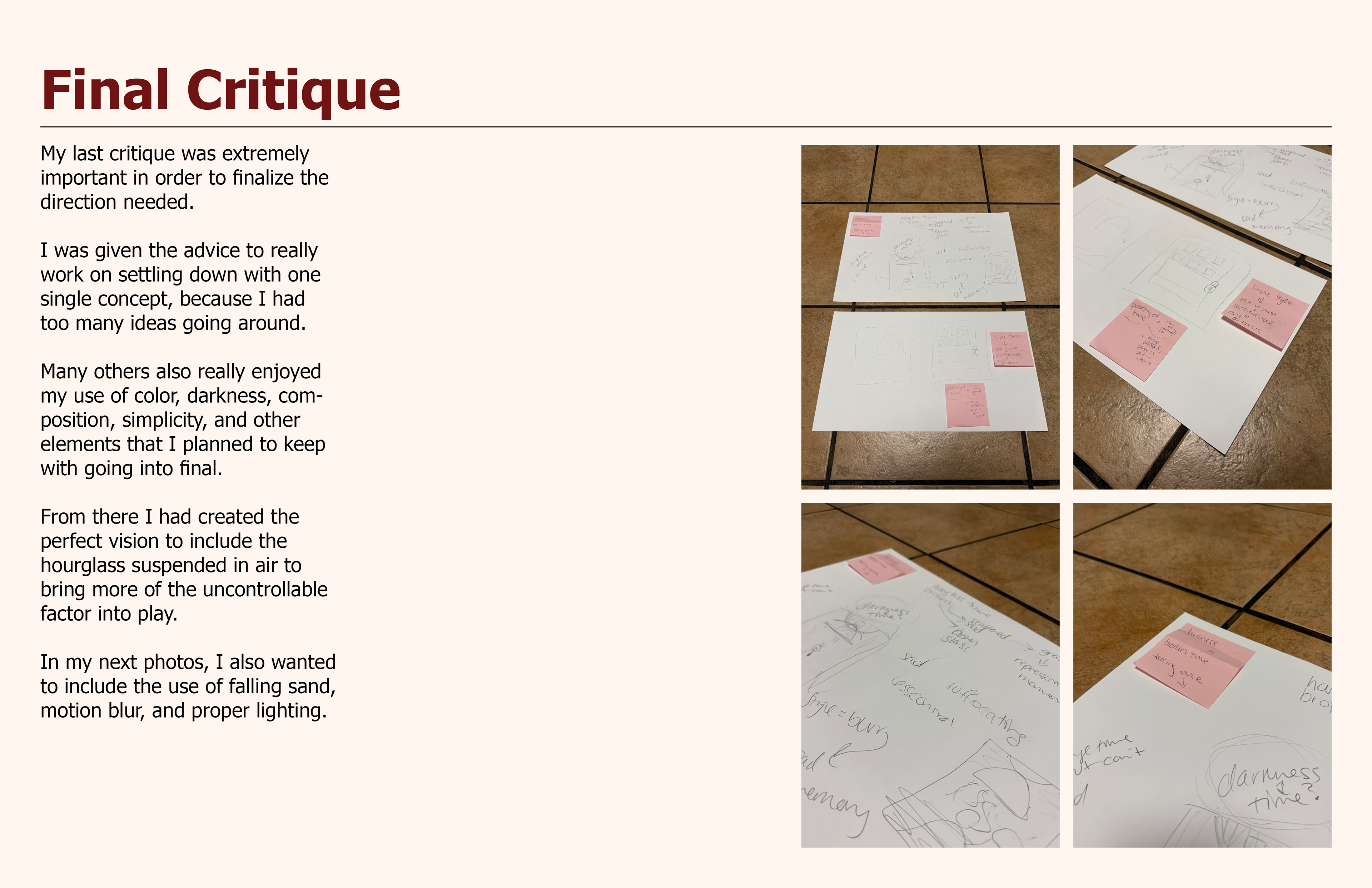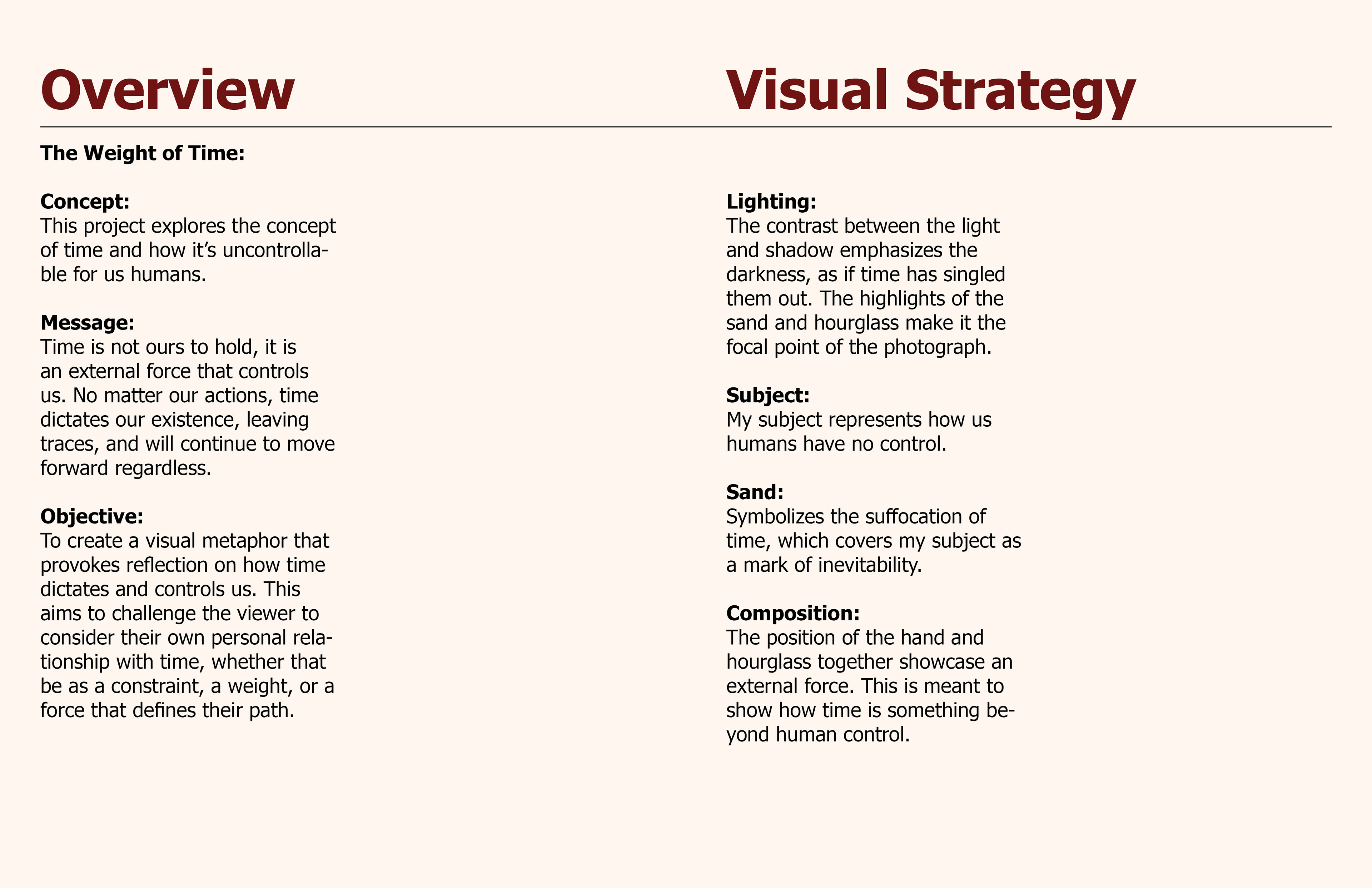 Conceptualized the nature of uncontrollable time, which lets viewers stop, reflect, and consider their own personal relationship with time, whether as a weight, a constraint, or a defining force. Emphasizing the lack of control, working with contrasts of light, and including proper detail helps create the mood of inevitability and darkness. Composing a piece that represents time as an external force that dominates human life.